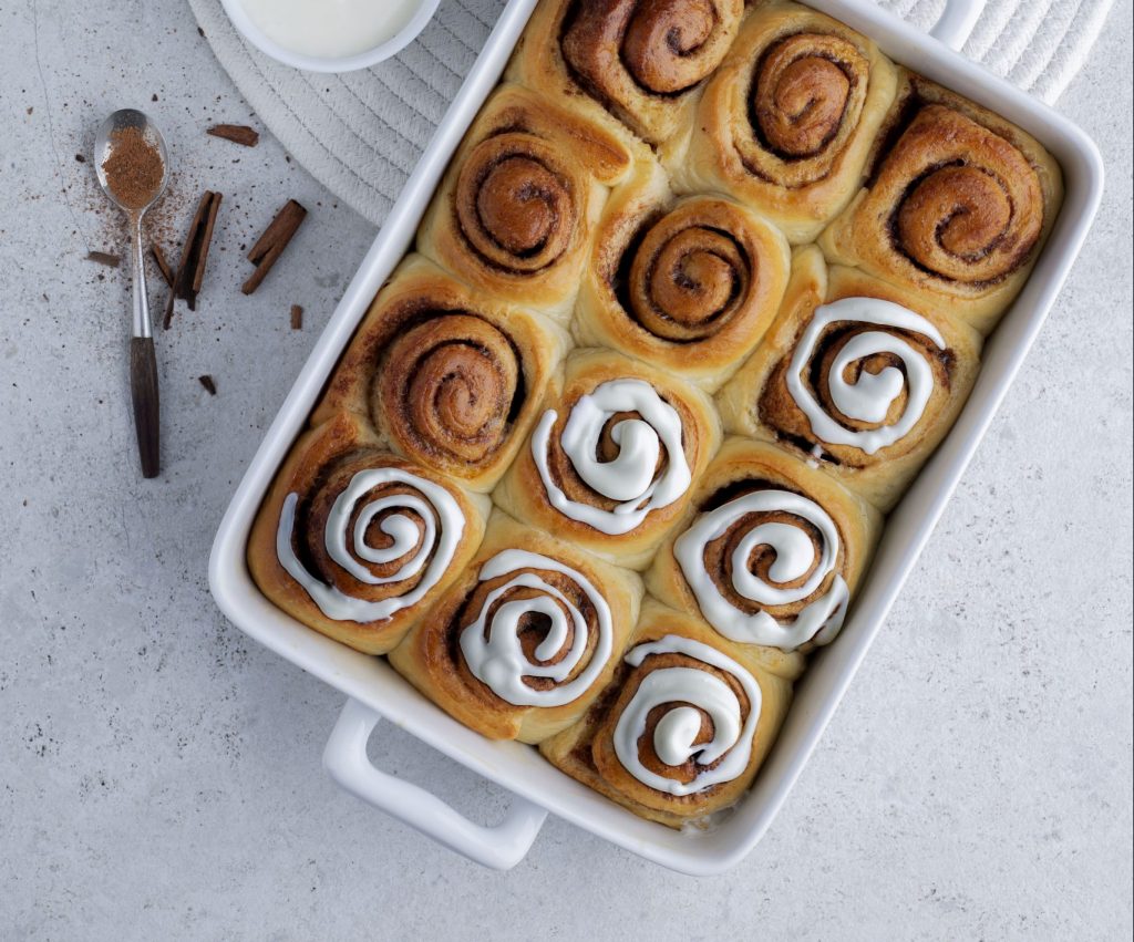 Gdy ciasto podwoi objętość, przełóż je na podsypaną mąką stolnicę i wyrabiaj chwilę, pozbywając się pęcherzy powietrza. Podziel na 2 części i rozwałkuj każdą na placki ok. 30×30 cm. Oba placki posmaruj miękkim masłem i posyp mieszanką brązowego cukru z cynamonem. Zawiń jak roladę i pokrój na plasterki o grubości 2-3 cm. Ułóż je na blasze wyłożonej papierem lub w formie, zachowując odstępy, a następnie odstaw do wyrośnięcia na ok. 30-40 minut.