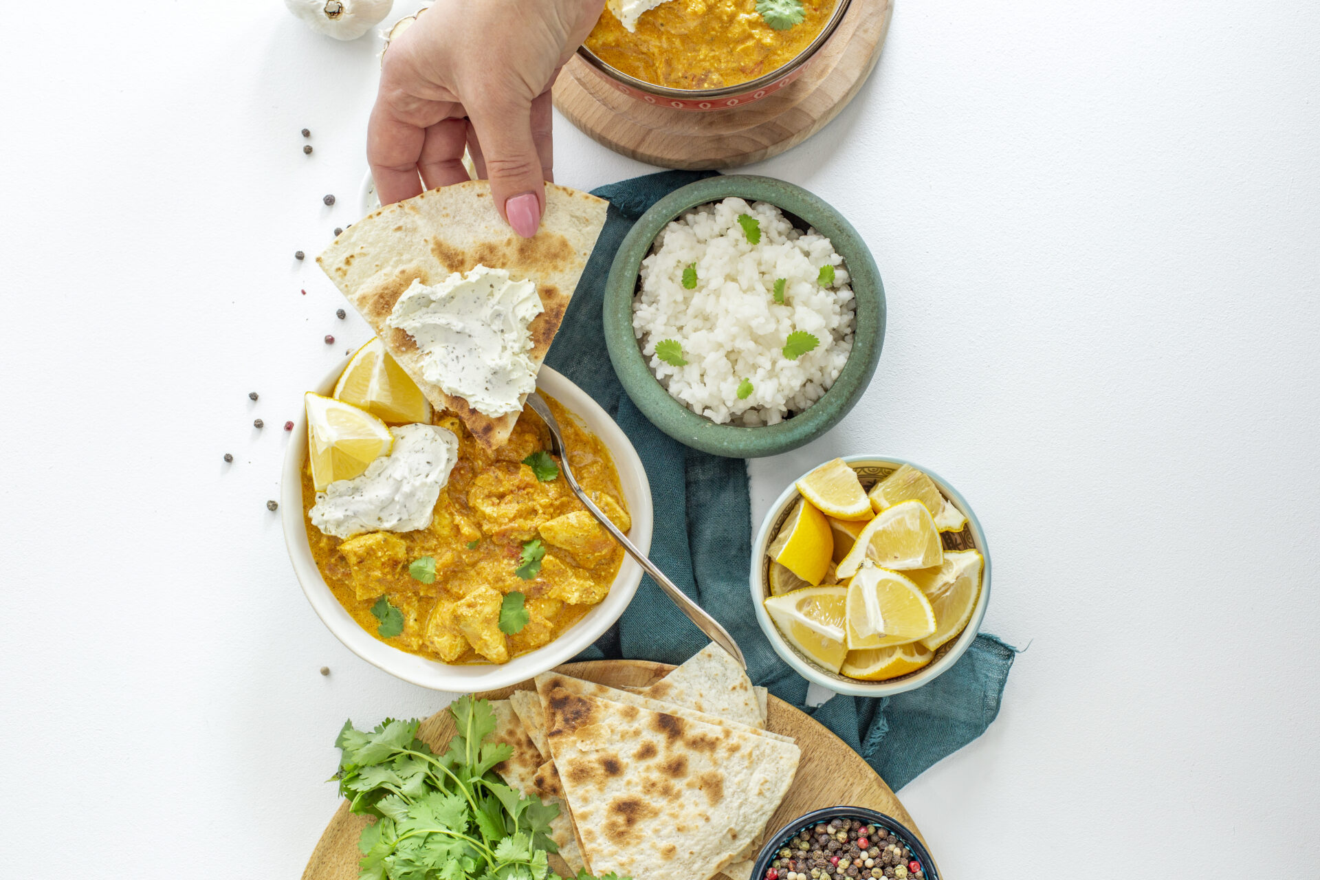 4. Butter chicken podawaj z ryżem i zarumienioną na suchej patelni tortillą. Danie udekoruj pozostałą porcją serka Philadelphia z ziołami, świeżą kolendrą i ćwiartkami cytryny.