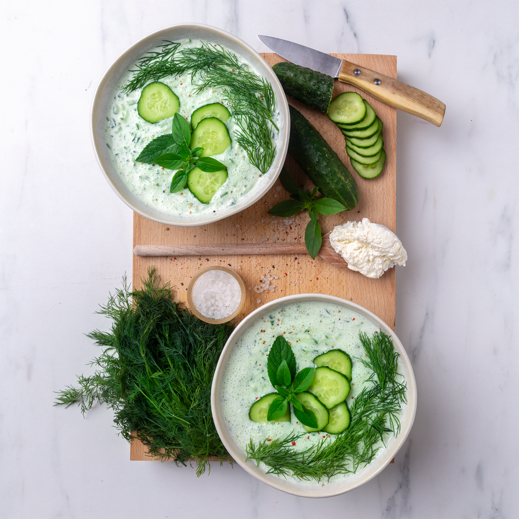 Przed podaniem udekoruj każdą porcję plasterkami ogórka, koperkiem i miętą.