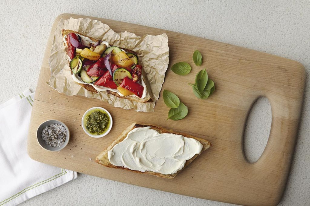 Połóż ciepłe warzywa na ciabattę z serkiem Philadelphia.