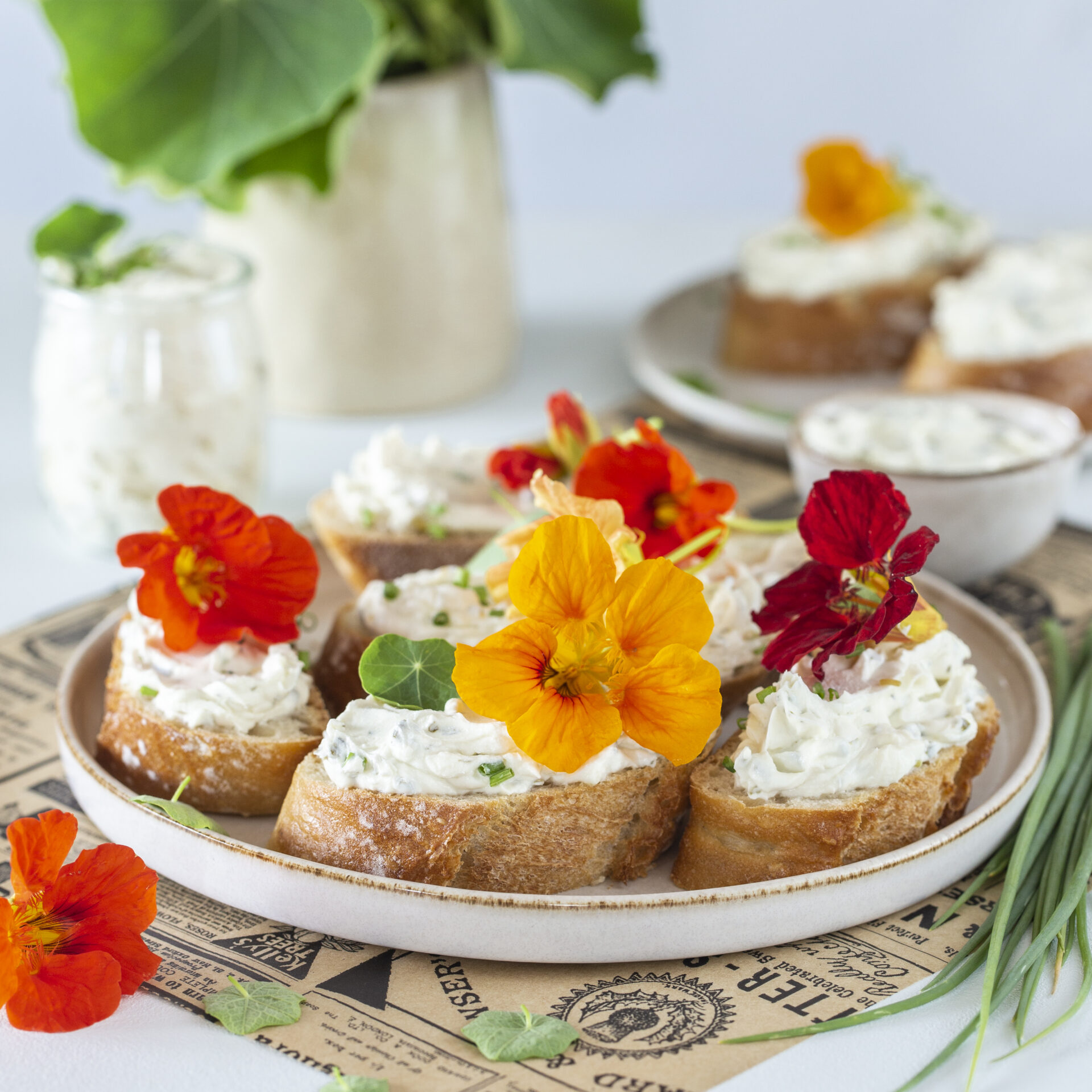 2. Bagietkę pokrój na kromki. Na każdą nałóż porcję pomazánki. Kanapeczki podawaj udekorowane posiekanym szczypiorkiem, listkami oraz kwiatami nasturcji.