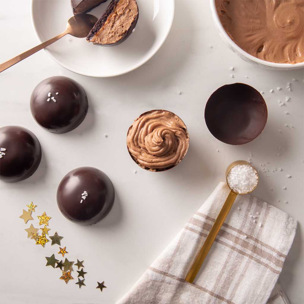 Z ciasta, po wyjęciu z zamrażarki, wytnij koła o takiej samej lub zbliżonej średnicy do półsferycznych foremek i posmaruj słonym karmelem. Czekoladowe foremki wypełnij musem przy pomocy rękawa cukierniczego i nałóż na ciasto z karmelem. Odstaw do lodówki na 10 minut. Serwuj posypane szczyptą soli gruboziarnistej.