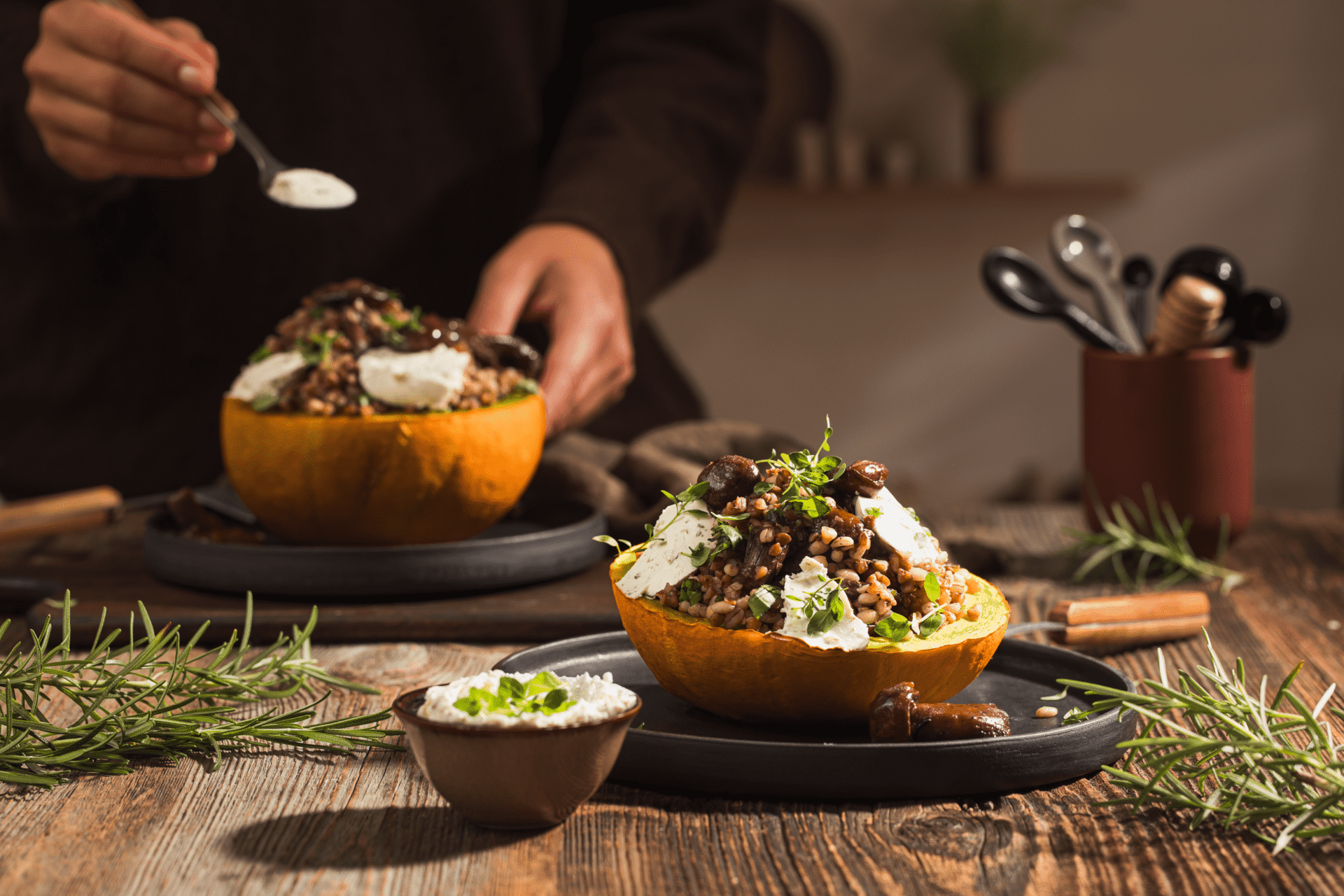 1. Do każdej połówki upieczonej dyni nałóż farsz.