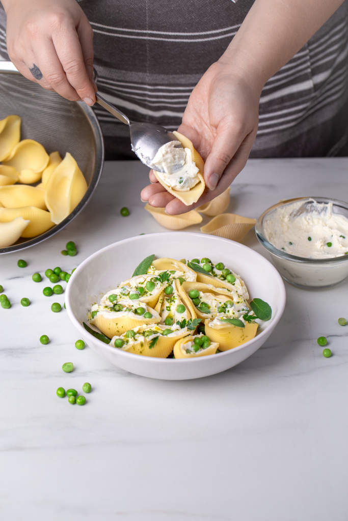 Przygotuj farsz. Serek Philadelphia wymieszaj z ziarenkami groszku, skórką z cytryny, pieprzem i solą.