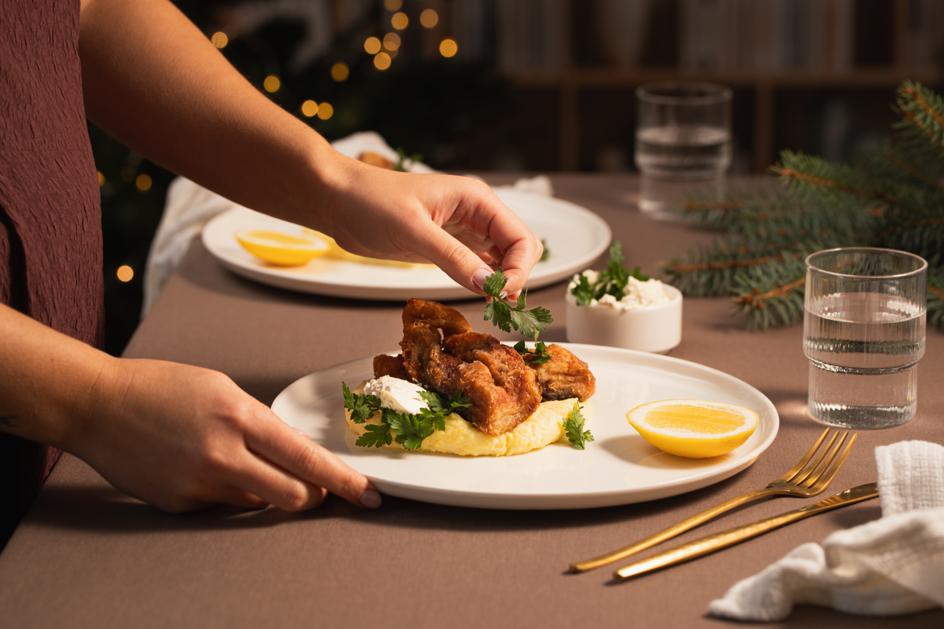 Na talerz nałóż porcję purée ziemniaczanego, na nim ułóż faworki z karpia.