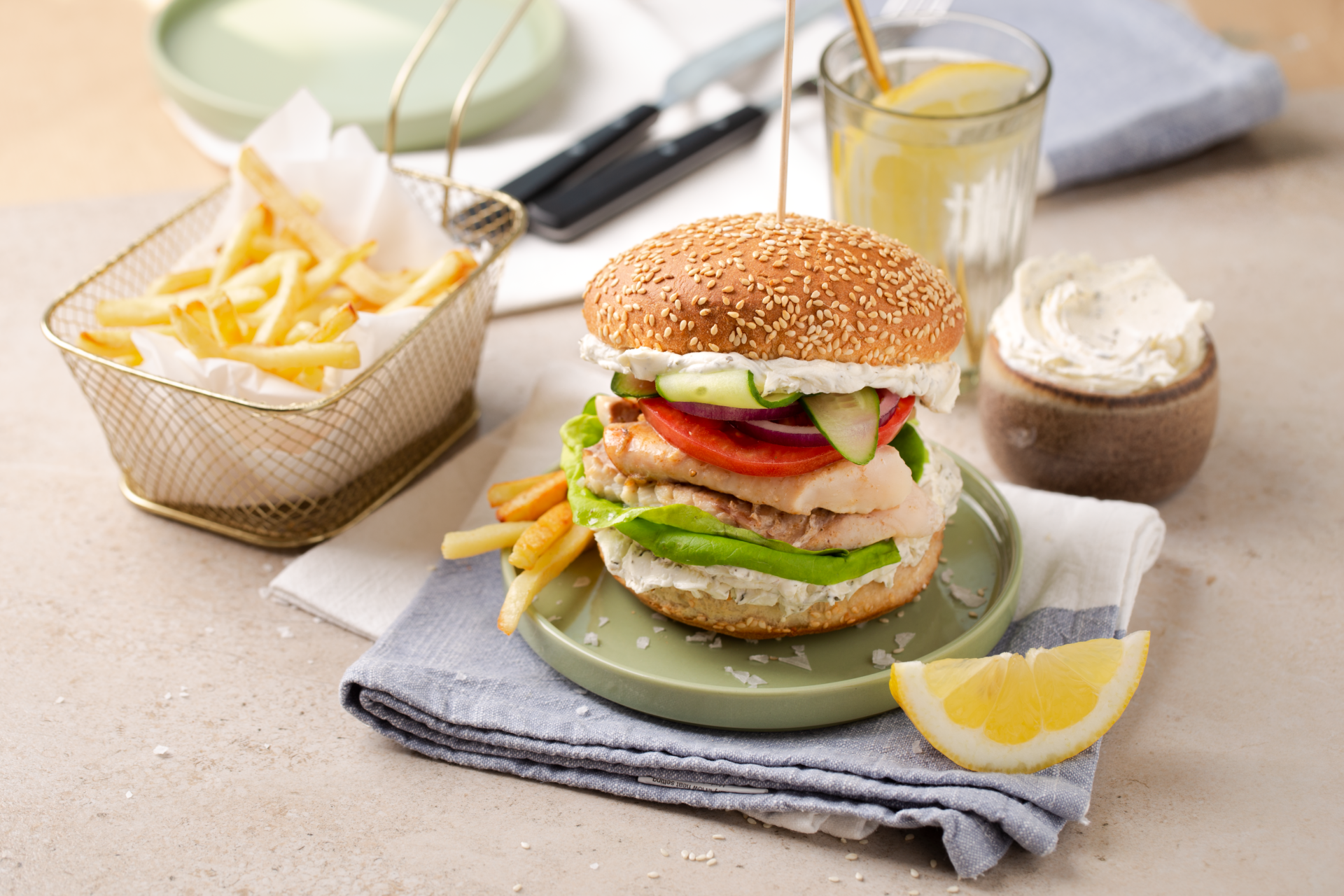 Posmaruj dolną połówkę bułki przygotowanym serkiem. Następnie ułóż po kolei: liście sałaty, kawałki ryby, plastry pomidora, krążki cebuli i plasterki ogórka. Przykryj górną połową bułki, również posmarowaną serkiem Philadelphia z ziołami.