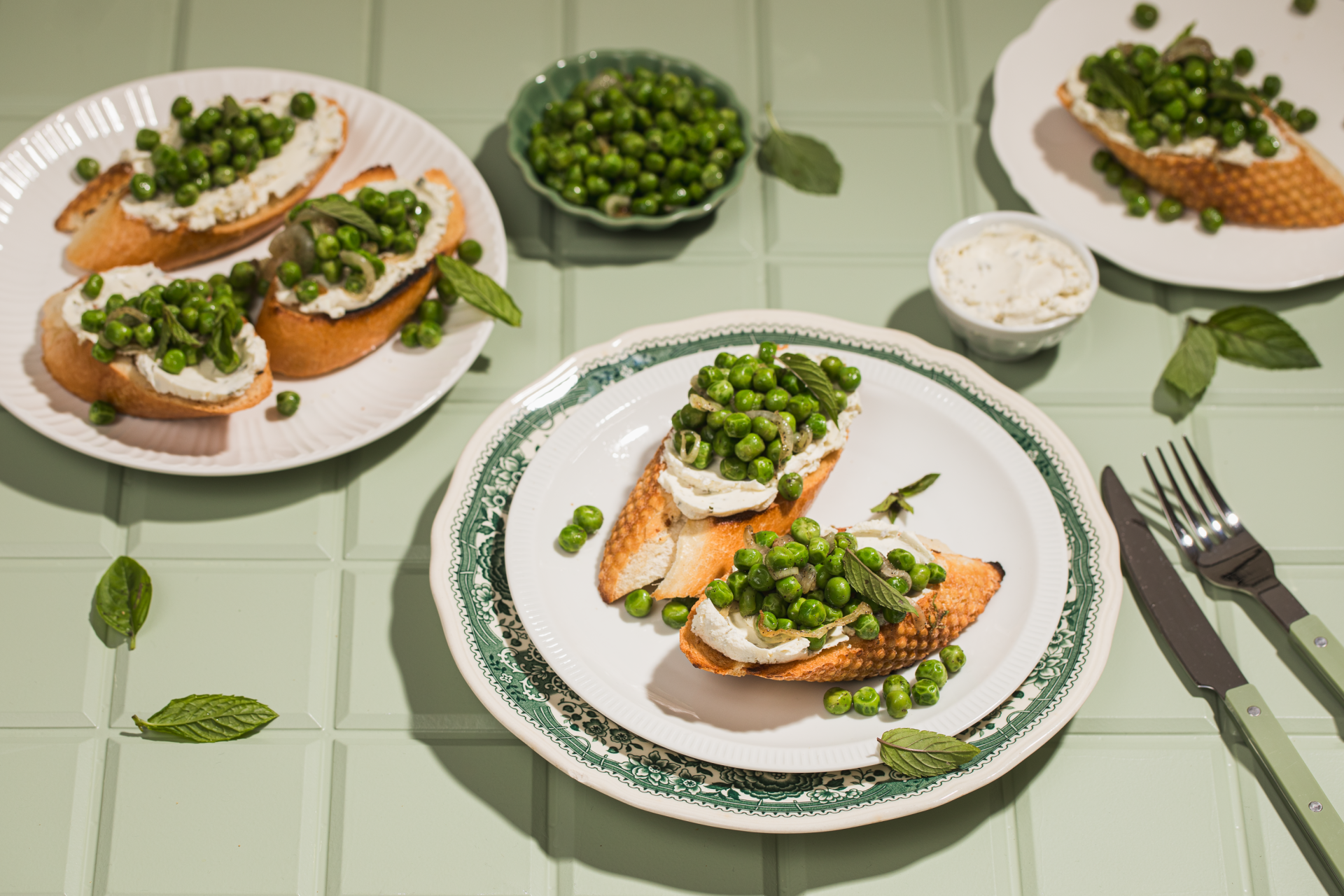Jeśli używasz mrożonego groszku – zalej go wrzątkiem na 2 minuty, odcedź i osusz. Następnie wymieszaj z oliwą z oliwek, sokiem z cytryny, podsmażoną cebulą, solą i pieprzem.