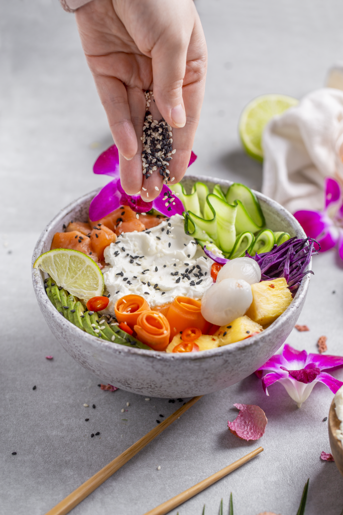 Posyp potrawę czarnym i białym sezamem, opcjonalnie udekoruj jadalnymi kwiatami.