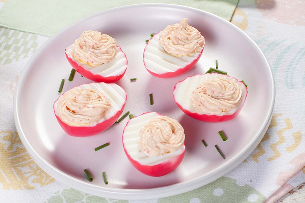 Obierz jajka ze skorupek, włóż je do wody z barwnikiem na kilka minut, a następnie wyjmij i osusz. Przekrój jajka nożem do wzorków. Delikatnie wyjmij żółtka.