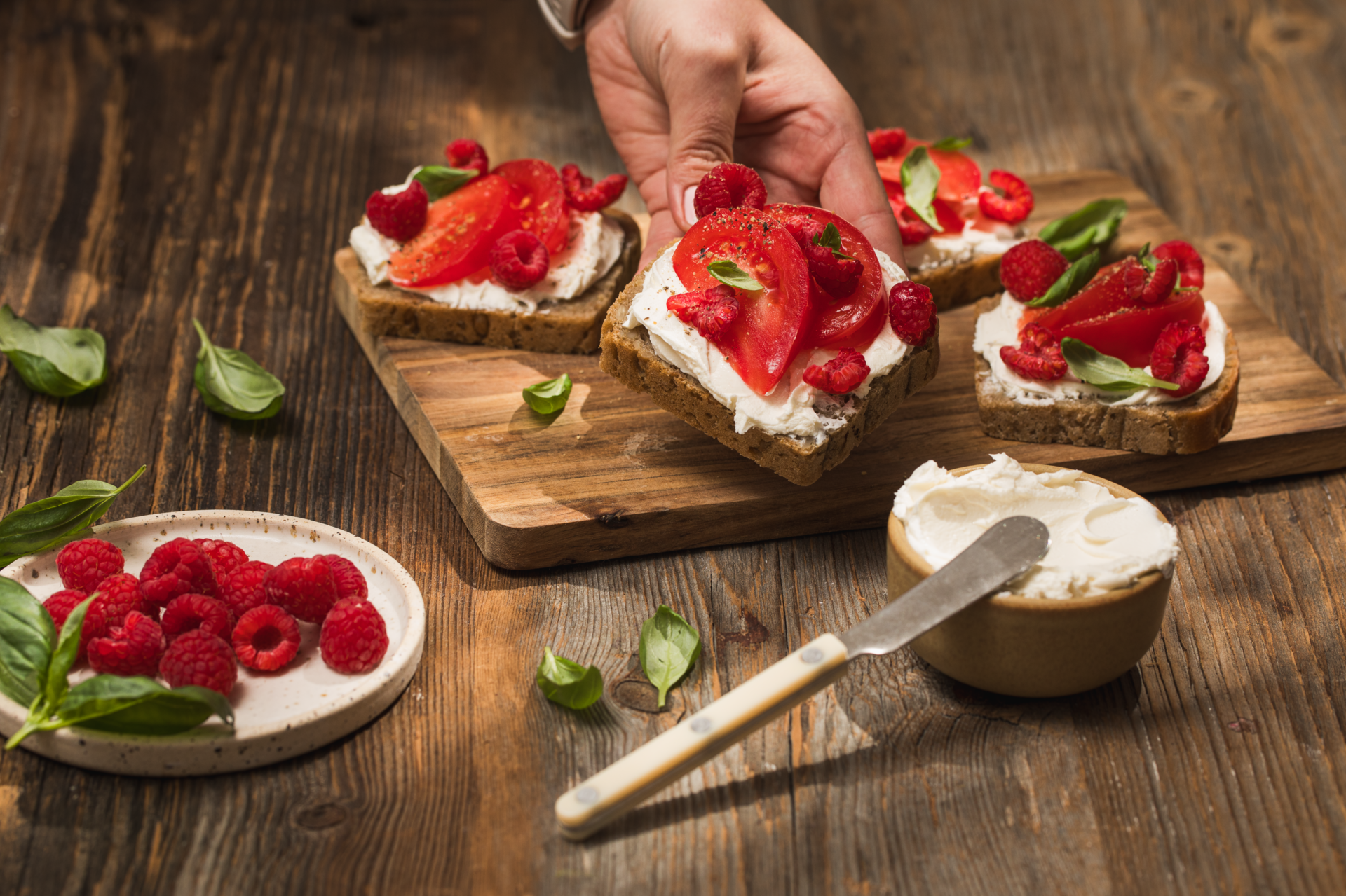Kanapki z chleba żytniego z pomidorami i malinami