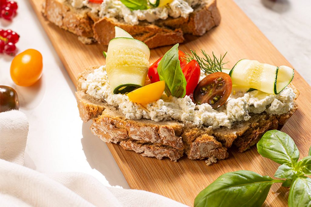 Kromki chleba posmaruj serkiem Phily ze szczypiorkiem. Na serek połóż cukinię, pomidorki i bazylię.