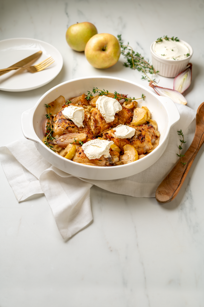 Zdejmij owoce z patelni, wlej cydr oraz bulion. Po 10 minutach od zagotowania dołóż ponownie kurczaka i wstaw całość do piekarnika na 30 minut.