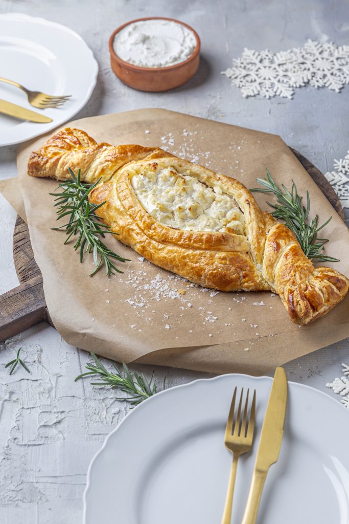 Zawiń dłuższe krawędzie ciasta w kierunku środka i mocniej zwiń na końcach, aby uzyskać kształt kokardy. Posmaruj wierzch rozbełtanym jajkiem i piecz przez 35 minut.