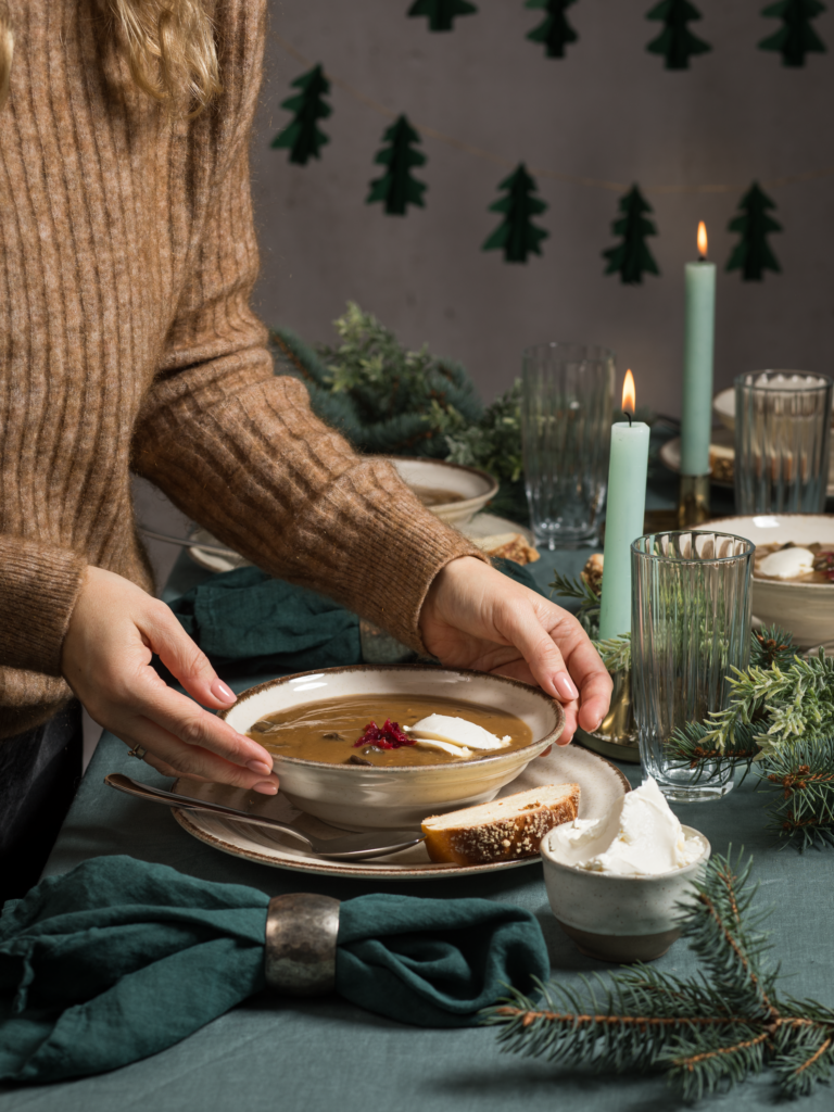 Zupę serwuj polaną cebulą, z kleksem serka oraz z chałką.