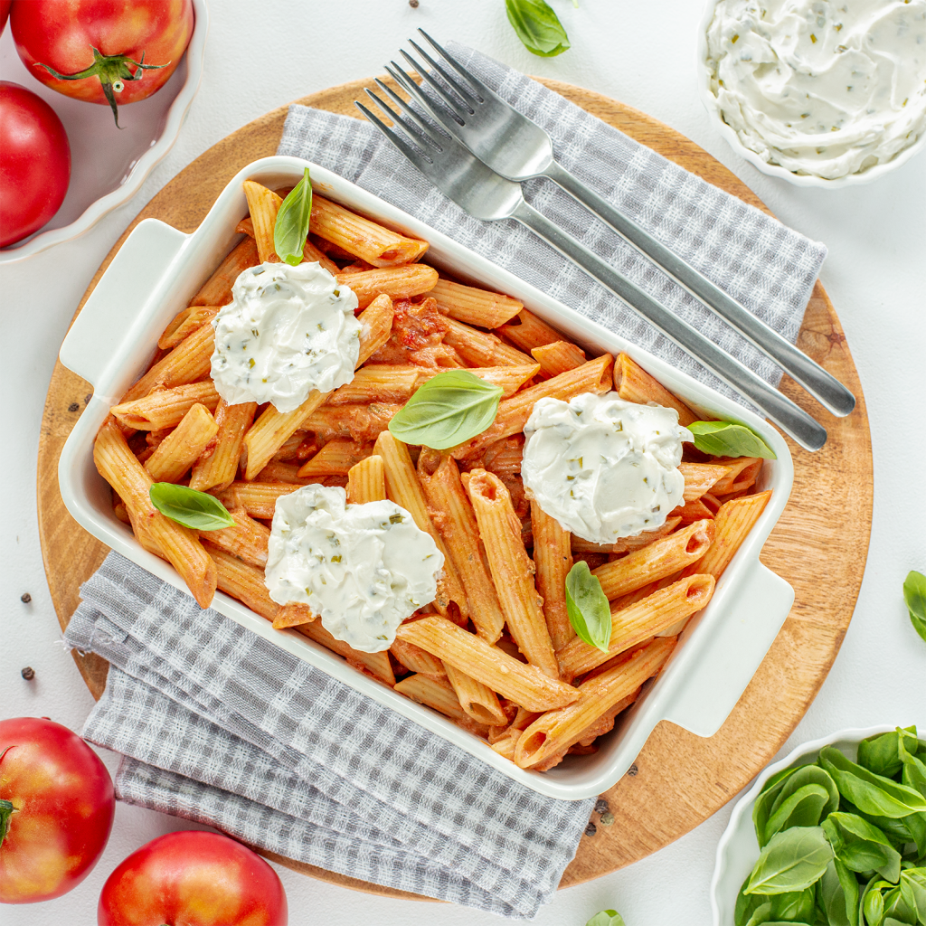 3. Danie udekoruj listkami bazylii oraz pozostałym serkiem Philadelphia ze szczypiorkiem.