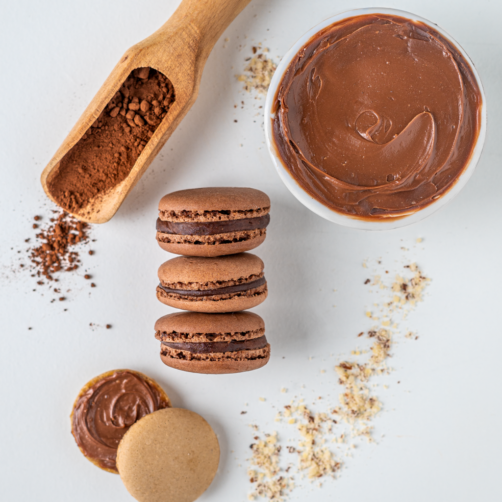 Przesiej do miski mąkę migdałową, cukier puder, kakao. Ubijaj białka, aż się spienią, dodawaj po łyżce drobnego cukru, cały czas ubijając, do uzyskania sztywności i roztopienia cukru. Nie ubijaj zbyt długo. Do białek dodaj wymieszane: mąkę, cukier, kakao. Mieszaj delikatnie do połączenia.