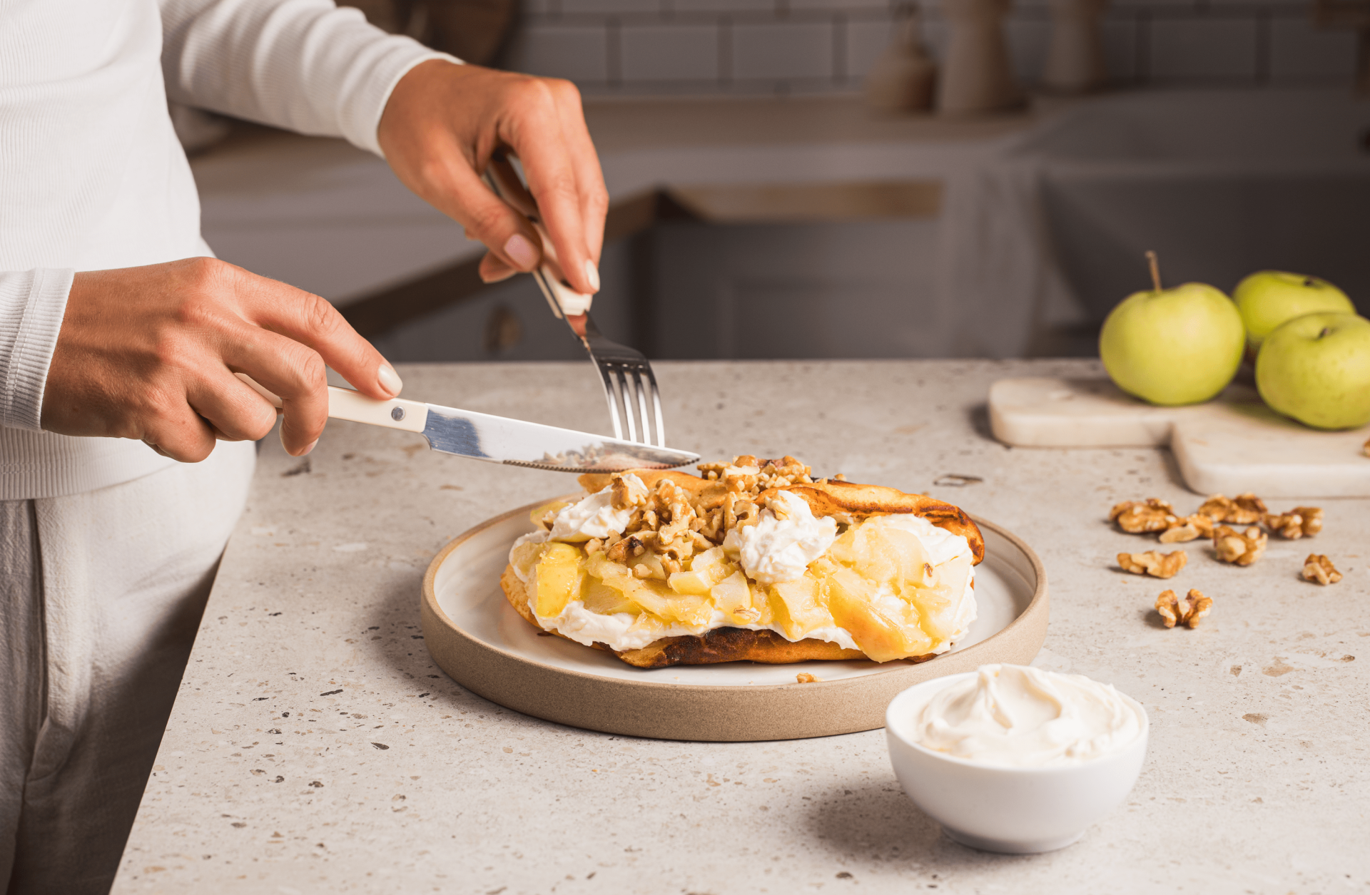 2. Posmaruj kremem, ułóż na nim jabłka i posyp orzechami włoskimi.