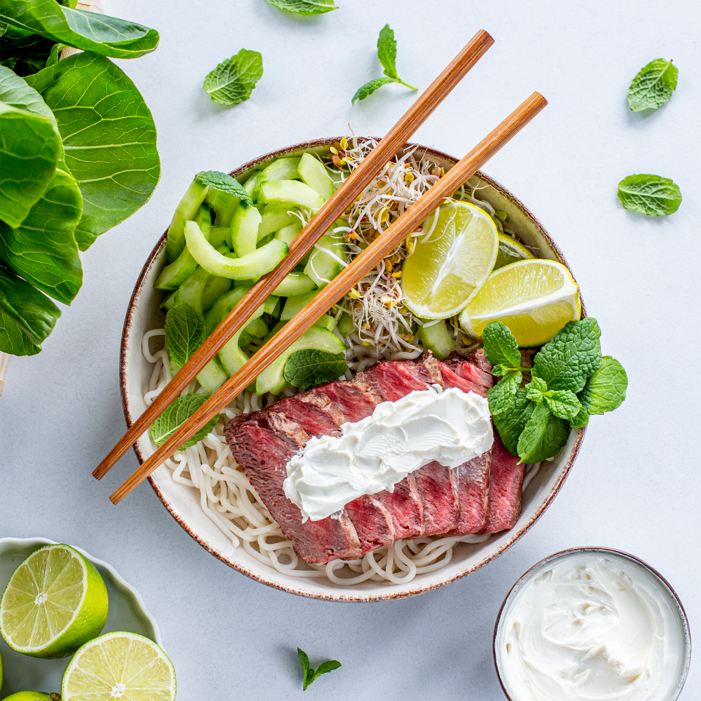 6. Noodle przygotuj wg instrukcji na opakowaniu. Ugotowany i odsączony makaron przełóż do dwóch misek, ułóż na nim plastry mięsa. Dodaj ogórka oraz kiełki. Wołowinę posmaruj dressingiem.