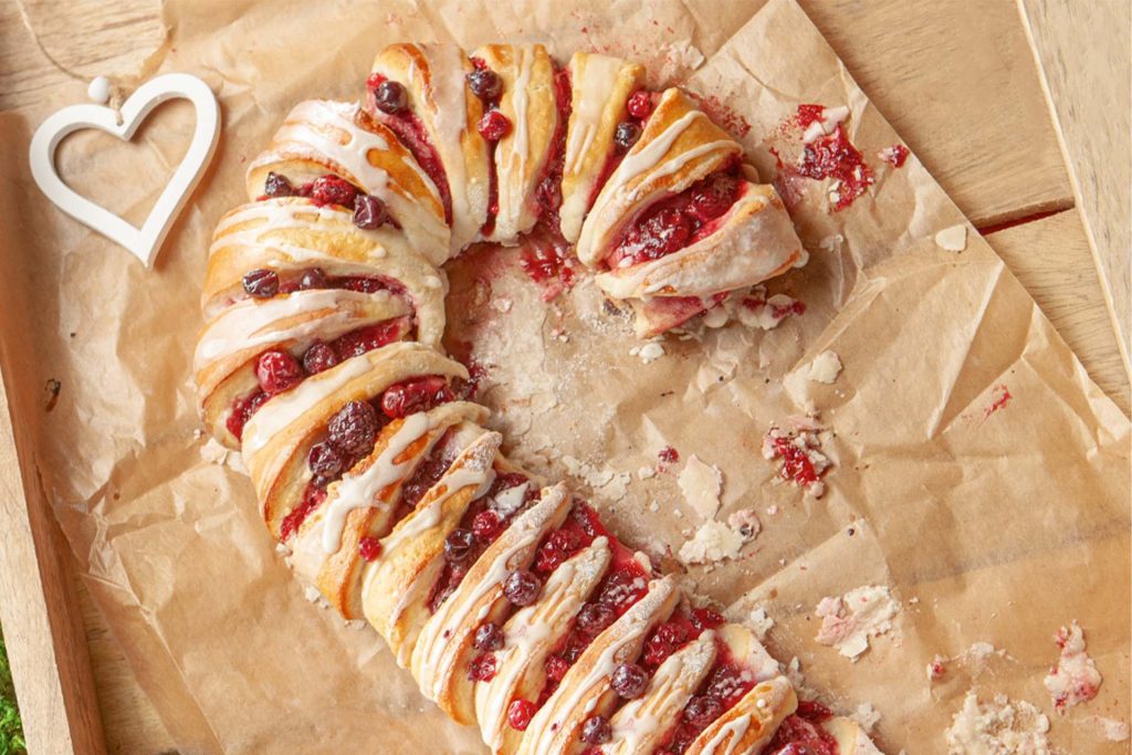 4. Zawijaj ostre końce trójkątów do środka, tak aby przykrywały serek i konfiturę. Pozostaw między nimi około centymetrowe przerwy, żeby spod ciasta było widać nadzienie.