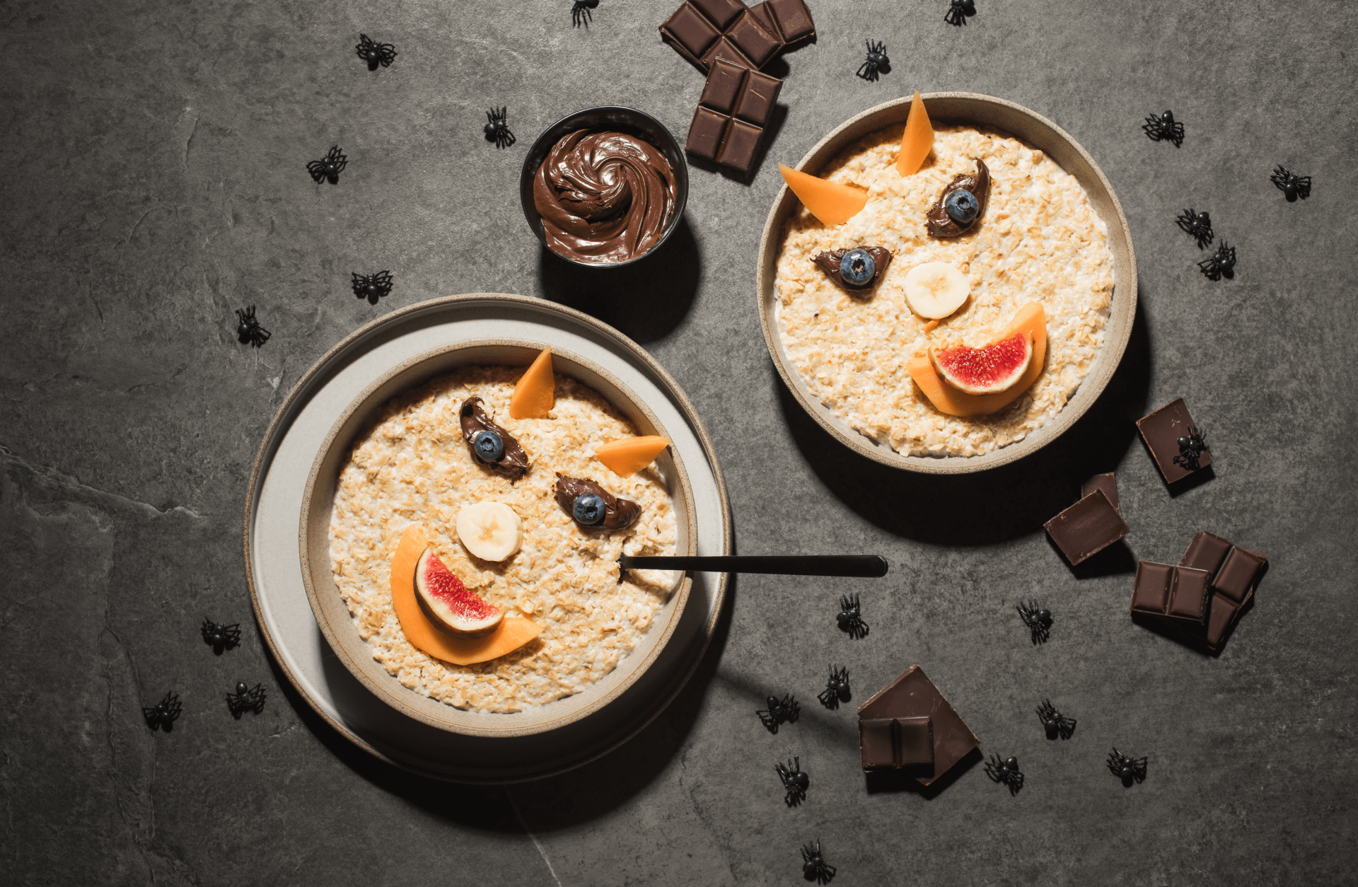 1. Rozłóż owsiankę do dwóch misek i udekoruj, żeby wyglądały jak uśmiechnięte stworki.