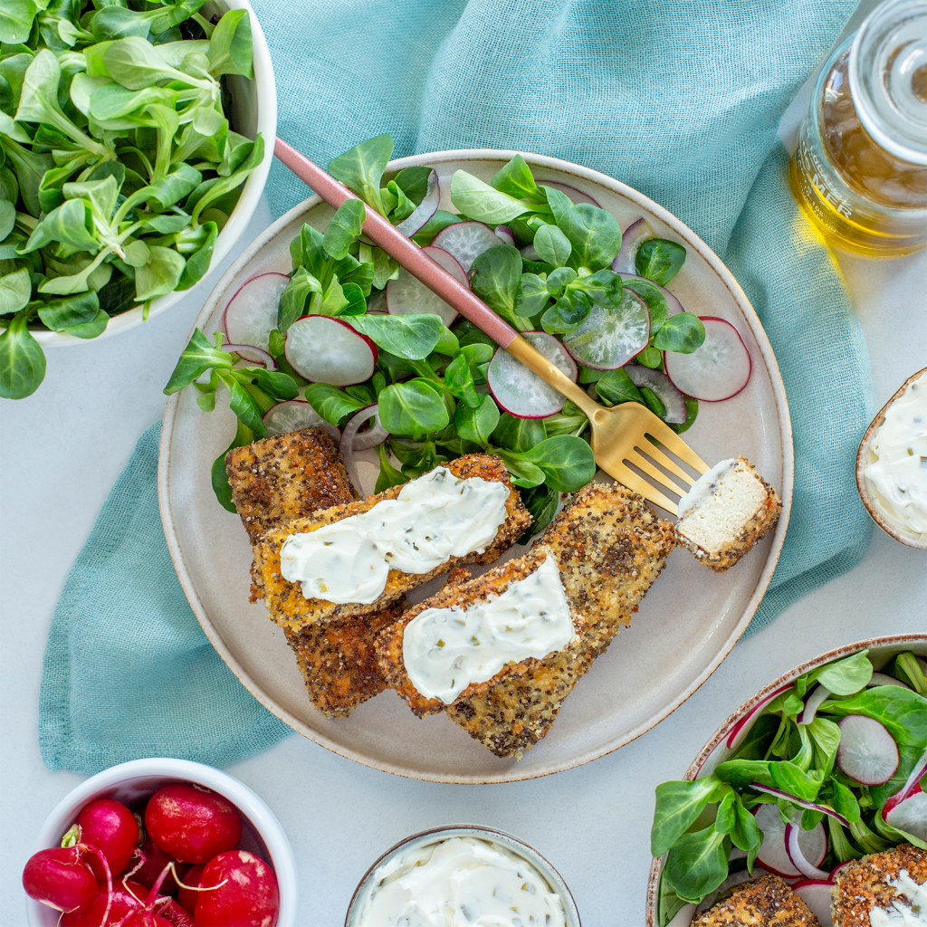 3. Rozgrzej olej na patelni. Kawałki tofu maczaj w białku, panieruj i kładź na rozgrzany olej. Smaż z każdej strony po 2-3 minuty. Usmażone paluszki ułóż na talerzu wyłożonym ręcznikiem papierowym (aby odsączyć je z nadmiaru oleju).