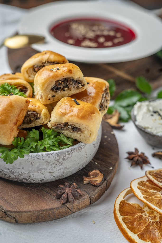 Wyrośnięte ciasto rozwałkuj na duży prostokąt i podziel na 4 długie pasy. Wzdłuż dłuższej krawędzi ułóż ¼ farszu i zawiń ciasto. Powtórz z kolejnymi 3 pasami ciasta i pozostałym farszem. Podziel powstałe roladki przy pomocy patyczka na małe paszteciki (ale nie przekrajaj), ułóż na papierze do pieczenia lub w naczyniu żaroodpornym, posmaruj rozbełtanym jajkiem, posyp sezamem i odstaw na 30 minut do wyrośnięcia.