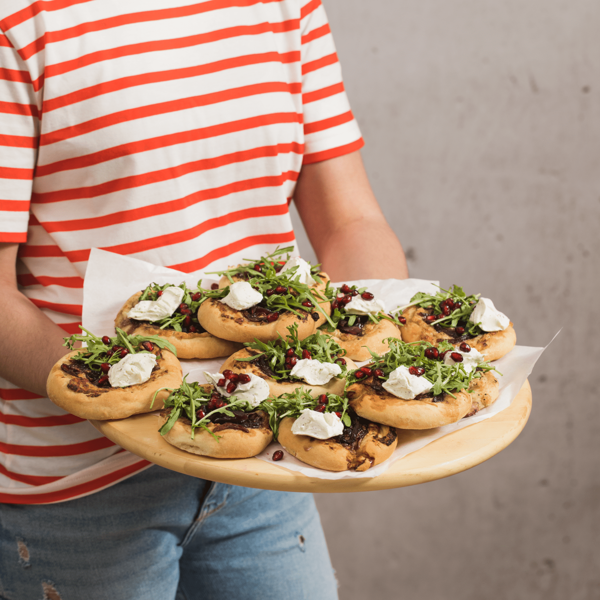 Pizzerki z karmelizowaną cebulą, rukolą i granatem