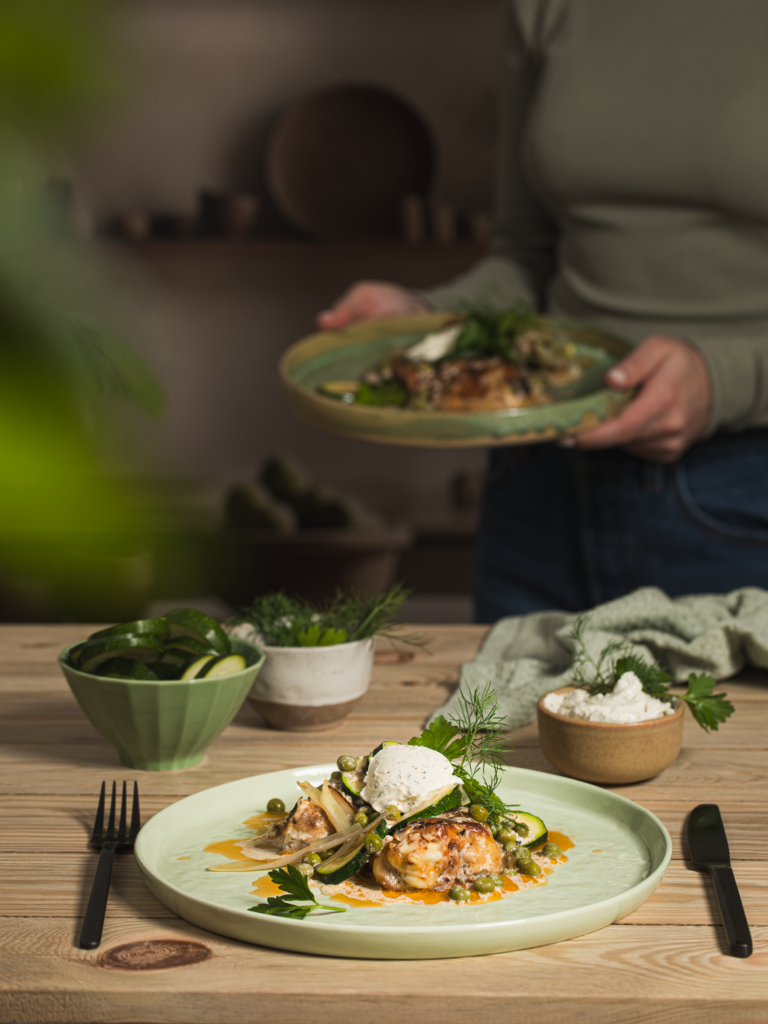 Piecz 20 minut. Wierzch udekoruj kleksami serka i ziołami.