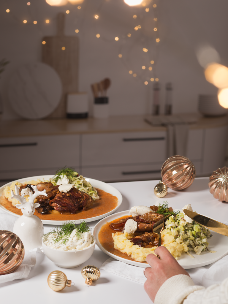 Polędwiczkę podawaj z purée i surówką porową. Potrawę ozdób kleksami serka.