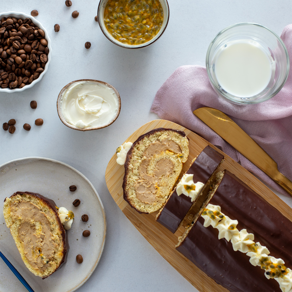 6. Wyjmij roladę z lodówki i oblej polewą czekoladową. Ponownie wstaw ciasto do lodówki na 15 minut. Po tym czasie udekoruj roladę bitą śmietaną z rękawa cukierniczego i miąższem z marakui.