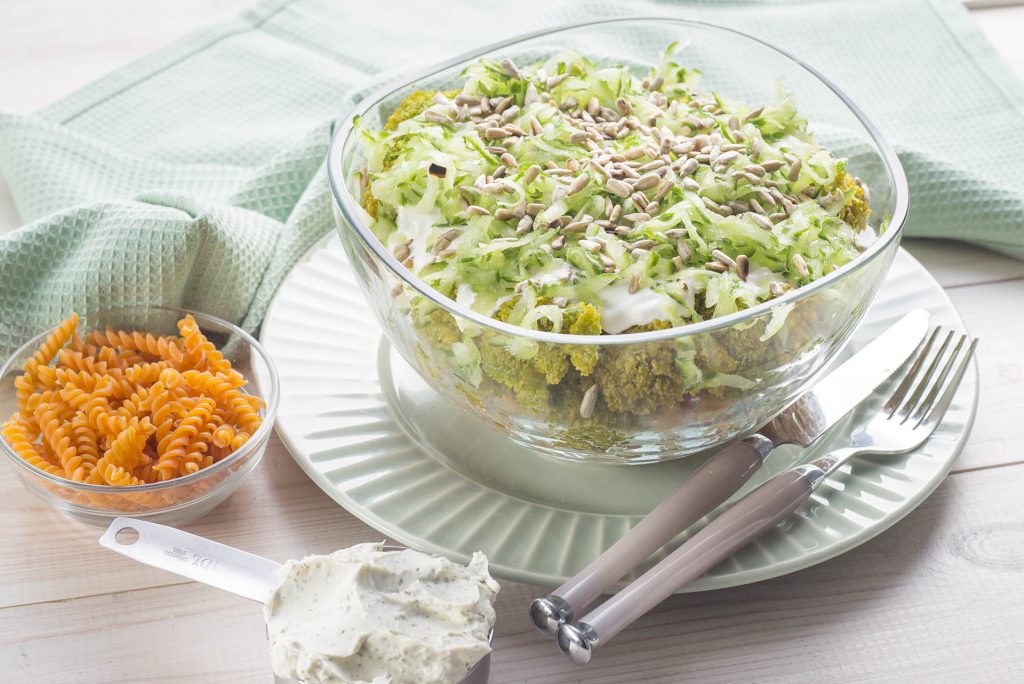 Makaron ugotuj w osolonej wodzie. Następnie przelej zimną wodą i oliwą z oliwek. Brokuł umyj i pokrój na średniej wielkości różyczki. Gotuj na parze około 10 minut. Ostudź. Utrzyj umytego i obranego ogórka na tarce o grubych oczkach i odciśnij nadmiar soku. Serek wymieszaj z wyciśniętym czosnkiem, jogurtem i przyprawami. Dodaj szczyptę cukru. Słonecznik upraż na patelni aż do przyrumienienia.
