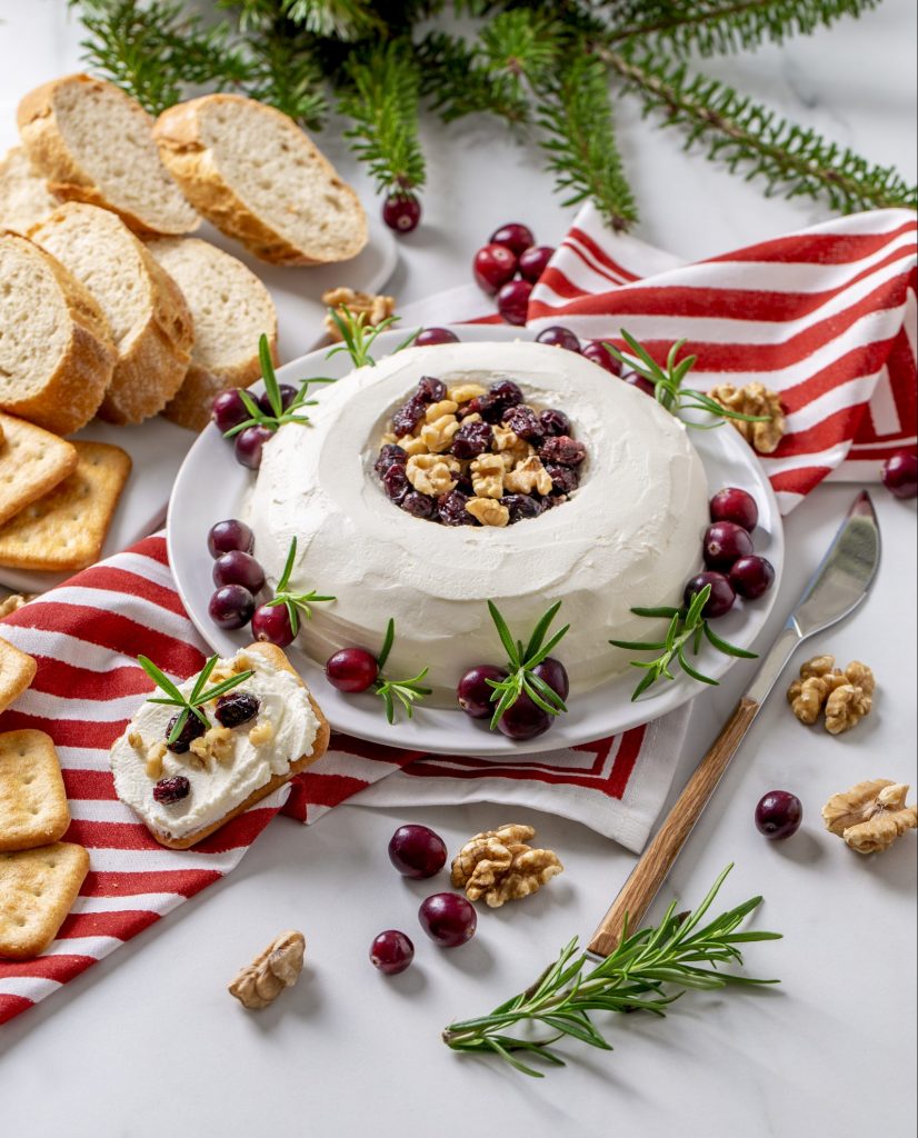Pośrodku talerzyka ustaw szklankę lub wysoki rant o średnicy ok. 9 cm, wokół uformuj okrąg z serka i wstaw do lodówki na 20 minut. Po wyjęciu przyozdób go świeżą żurawiną oraz gałązkami rozmarynu.