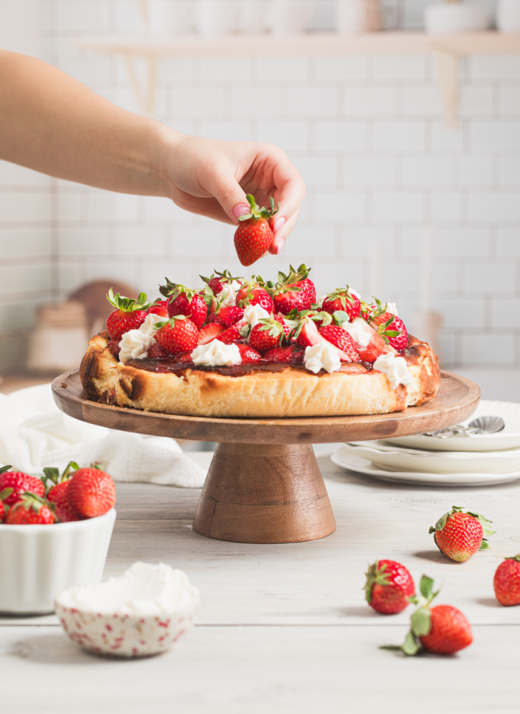 Pozostałe 150 g truskawek umyj, usuń szypułki i pokrój na ćwiartki. Obsyp nimi wierzch sernika.