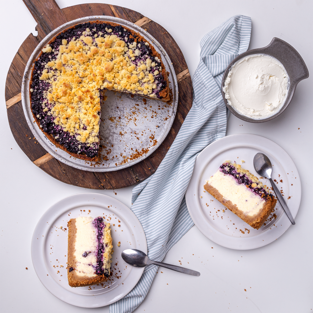 Wyjmij z lodówki tortownicę, wypełnij ją masą serową, na wierzchu ułóż jagody i obficie posyp kruszonką.