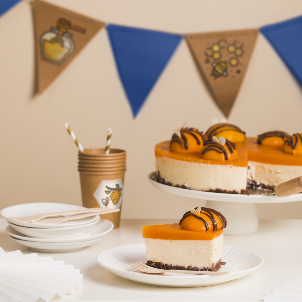 Brzoskwinie z drugiej puszki wyłóż na ręcznik papierowy i osusz. Czekoladę rozpuść razem ze śmietanką i udekoruj połówki owoców jak pszczółki, rysując na nich paski za pomocą rękawa cukierniczego lub woreczka strunowego z odciętym rogiem. Skrzydełka z migdałów wetknij w naciętą górę brzoskwiń. Udekorowane brzoskwinie poukładaj na brzegu sernika. Pokrój ciasto na 8 części.