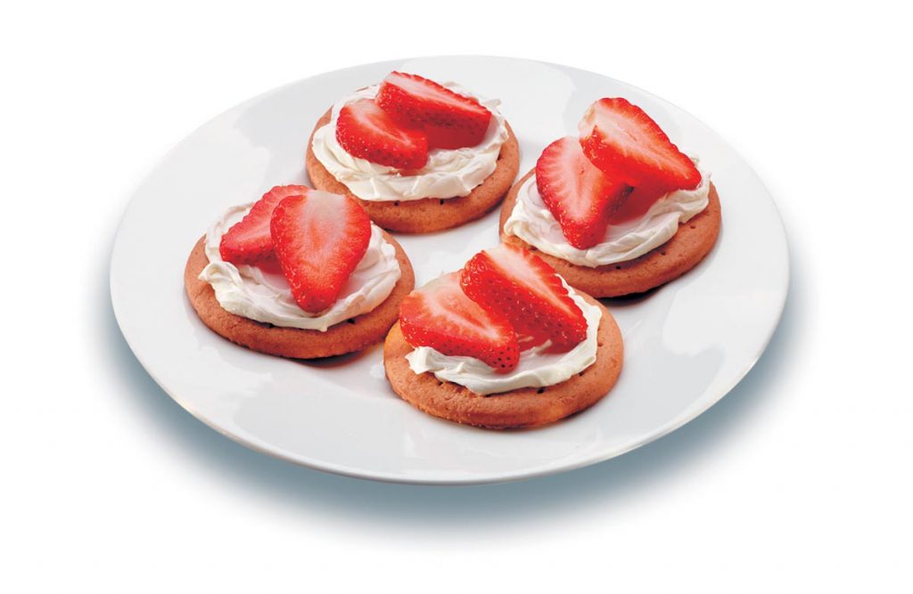 Aby przygotować szybki deser, rozsmaruj serek Philadelphia na biszkoptach. Na wierzchu połóż pokrojone truskawki.