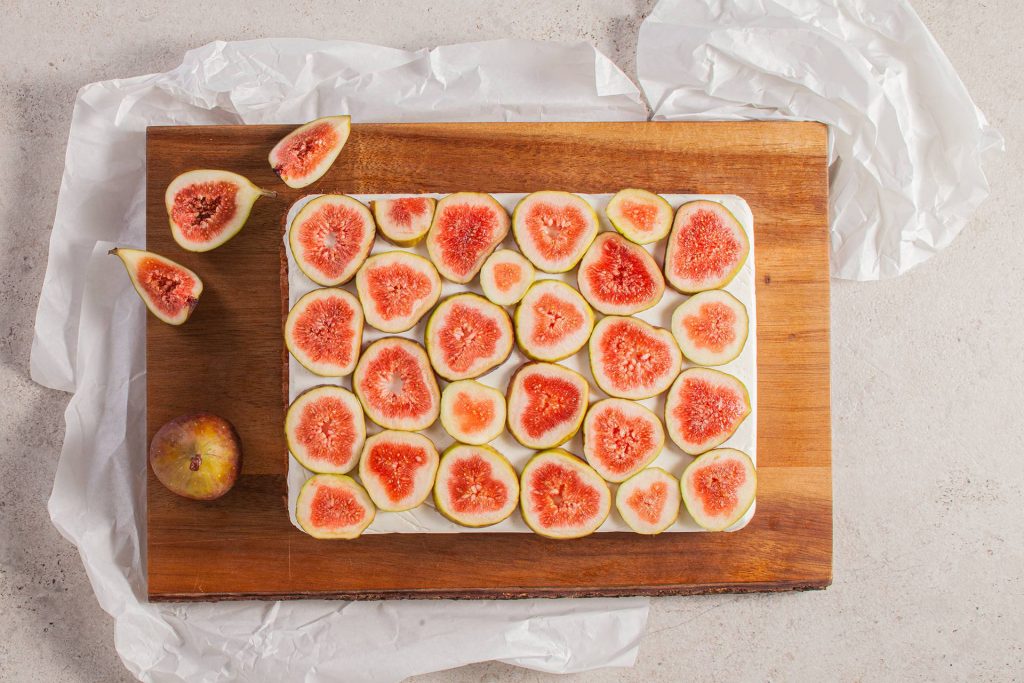 Rano wyjmij sernik i figi z lodówki. Ułóż sernik na spód biszkoptowy, zdejmij folię. Figi pokrój ostrym nożem i ułóż na wierzchu ciasta.