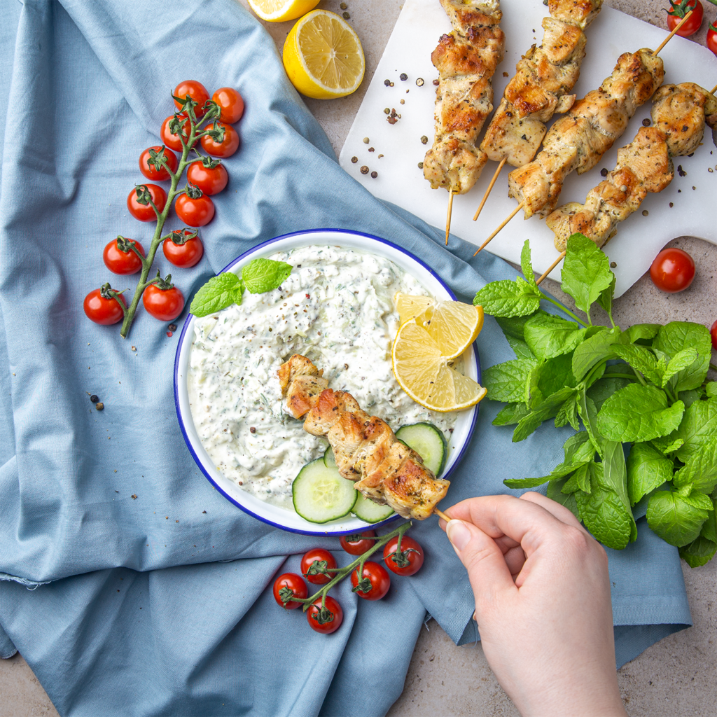 W tym czasie przygotuj tzatziki: zetrzyj ogórka na grubych oczkach tarki, a miętę posiekaj. Serek Philadelphia z ziołami wymieszaj z sokiem z cytryny, a następnie z ogórkiem oraz miętą. Przełóż sos do miseczki.
