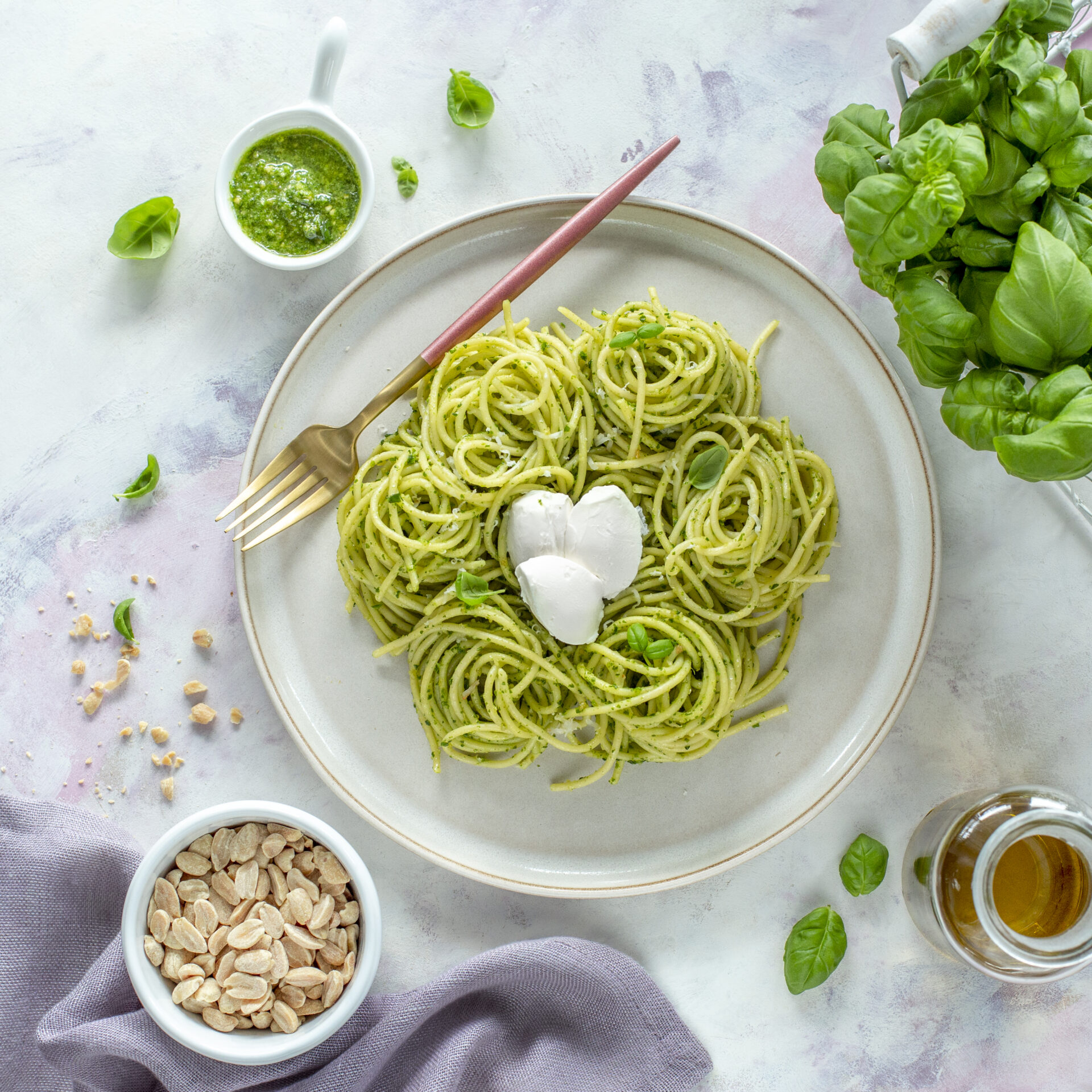 1. Opłucz bazylię i przełóż do blendera (kilka listków zostaw do dekoracji). W kielichu blendera umieść również: orzeszki, starty parmezan oraz oliwę. Składniki pesto dokładnie zmiksuj.