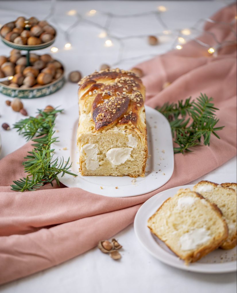Wyrośnięte ciasto drożdżowe rozwałkuj, posmaruj serkiem, zwiń w rulon i rozetnij wzdłuż na pół. Oba kawałki ciasta skręć wokół siebie i przełóż do formy 11×25 cm wyłożonej papierem do pieczenia. Ponownie odstaw do wyrośnięcia na pół godziny.