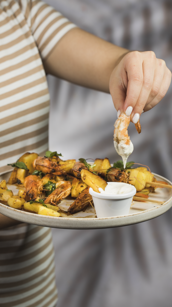 Obierz ananasa i pozbaw go środka. Pokrój owoc w półtoracentymetrową kostkę. Na patyczki do szaszłyków nadziewaj po 3 krewetki na zmianę z ananasem. Sos sojowy wymieszaj z sokiem z limonki i miodem.