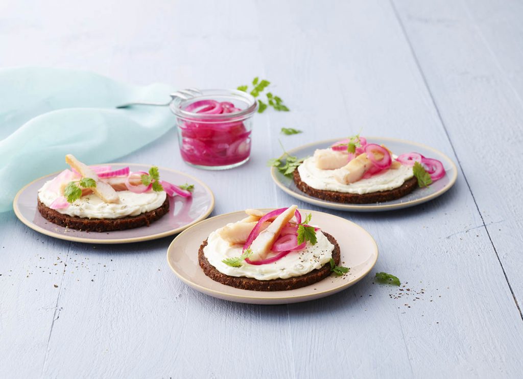 Pstrąga pokrój na kawałki. Talarki pumpernikla posmaruj serkiem Philadelphia. Połóż na nie cebulę zamarynowaną w occie winnym i cukrz oraz rybę. Całość udekoruj trybulą.