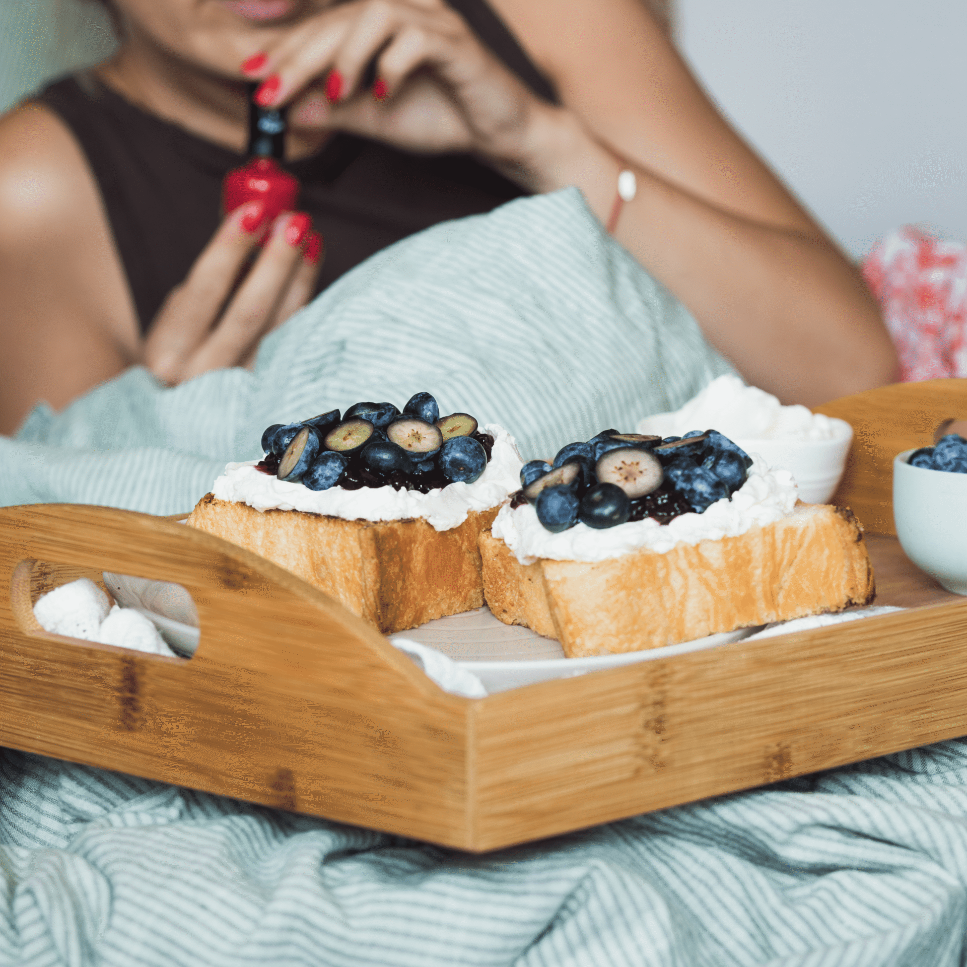 Rozsmaruj serek na obu tostach, nałóż konfiturę i posyp połową całych borówek. Drugą połowę borówek poprzecinaj na pół i również posyp nimi tosty.