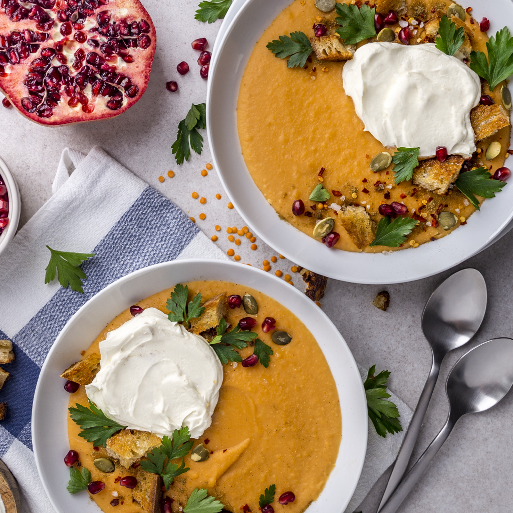 Serwuj zupę z natką pietruszki i grzankami. Posyp każdą porcję pestkami dyni i grantu.