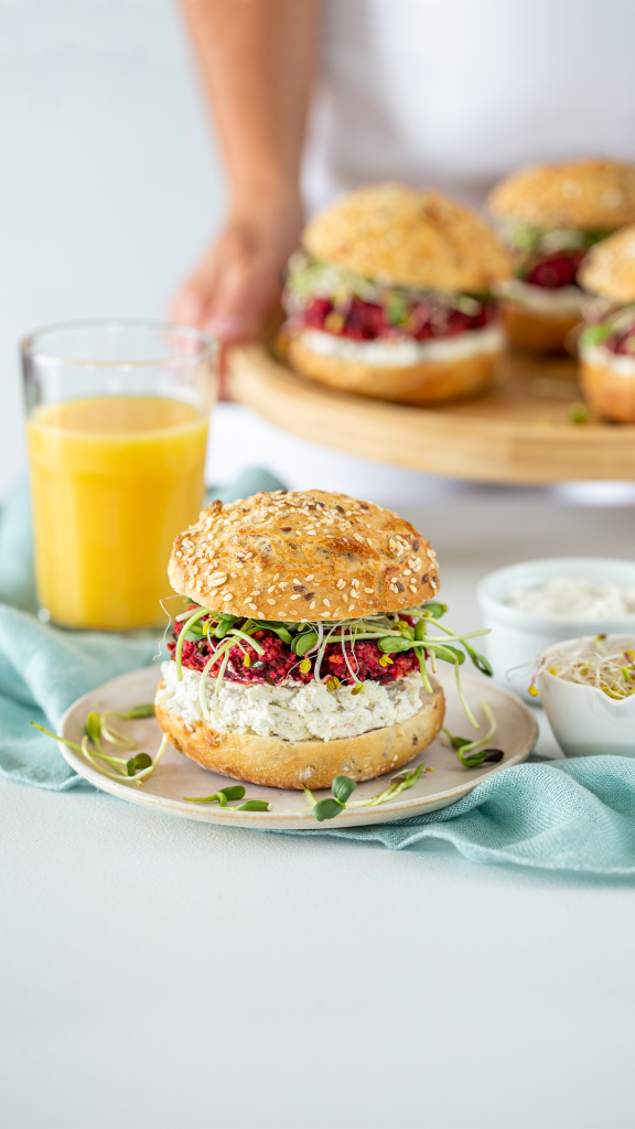 3. Bułki przekrój na pół. Każdą dolną połówkę posmaruj 50 g serka Philadelphia z ziołami. Następnie nałóż jaglano-warzywne burgery, kiełki i przykryj wierzchnią częścią pieczywa.