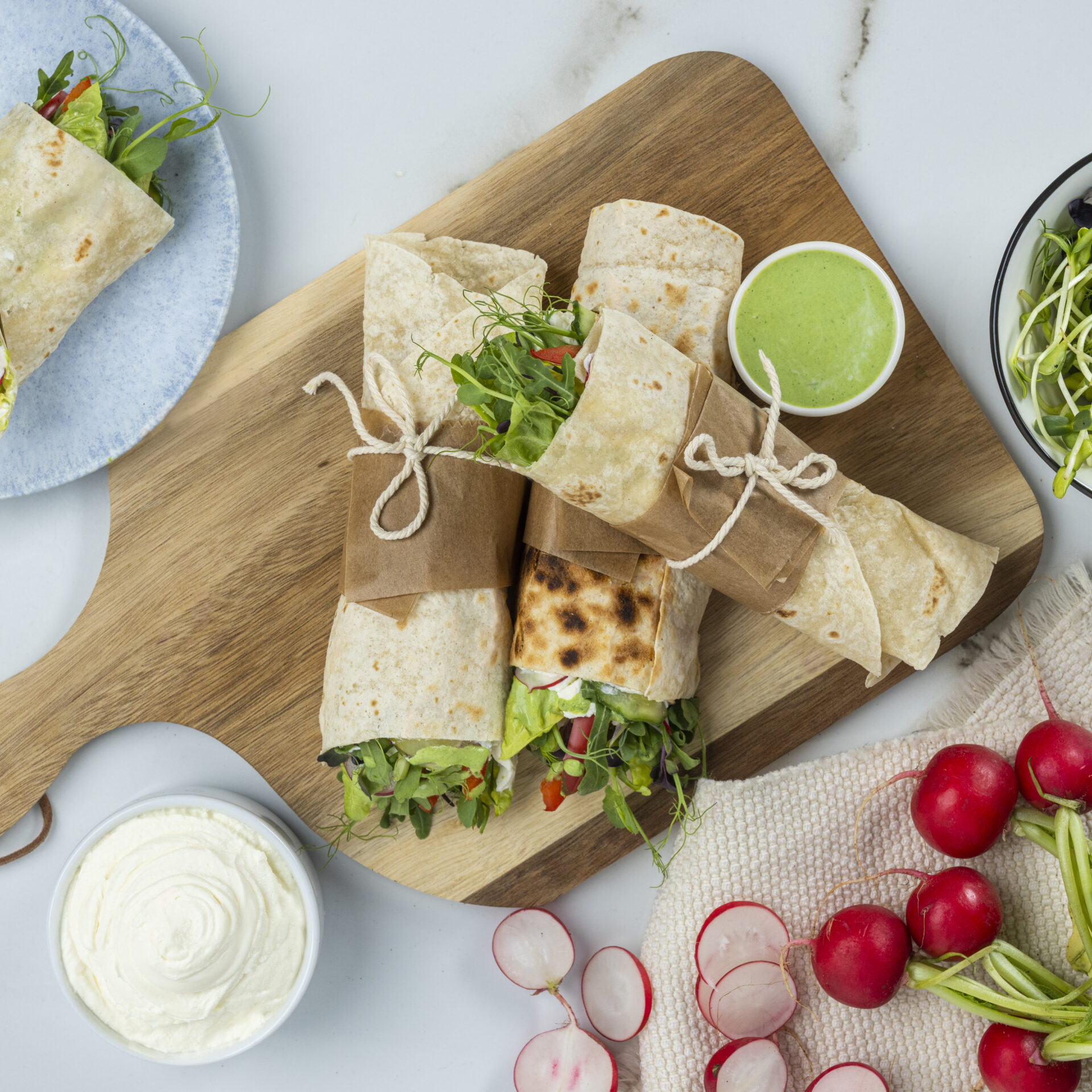 Na każdym placku rozłóż porwaną sałatę. Warzywa rozłóż w odległości 3 cm od brzegu, następnie zwiń ciasno w rulon i przekrój na pół każdą porcję.