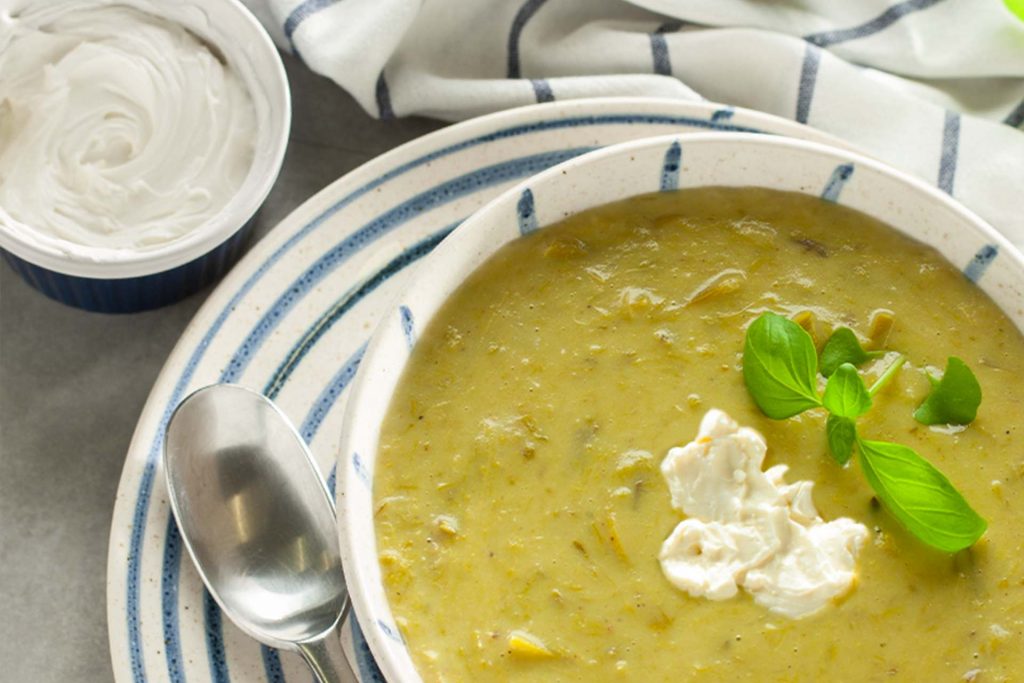 6. Do wystudzonego wywaru z warzywami dodaj śmietanę wymieszaną z mąką, sok z cytryny, sól i pieprz. Zmiksuj zupę, a następnie podgrzej.
