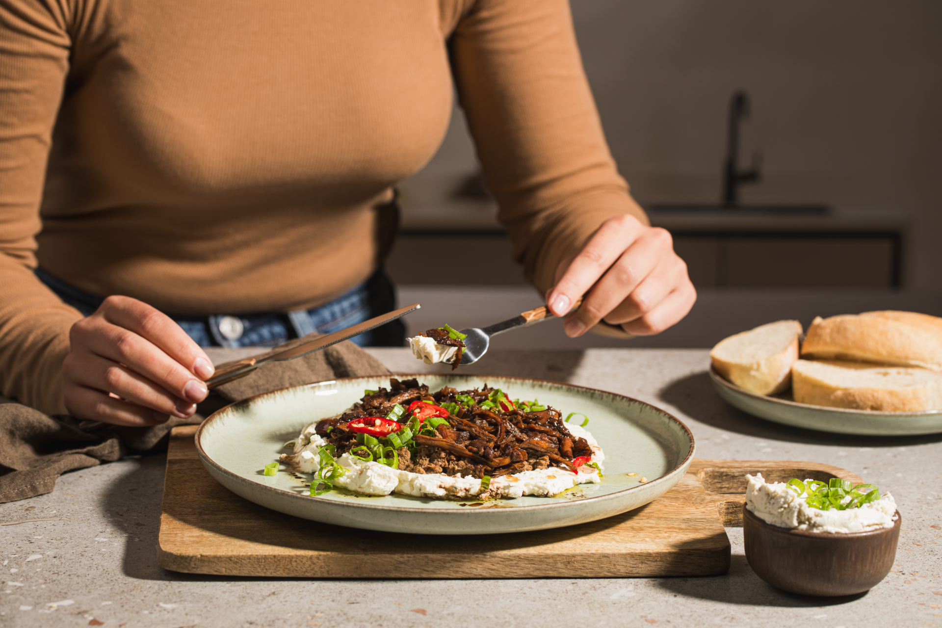 Na wierzch wyłóż porcję szarpanej, soczystej wołowiny wraz z odrobiną sosu z pieczenia.
