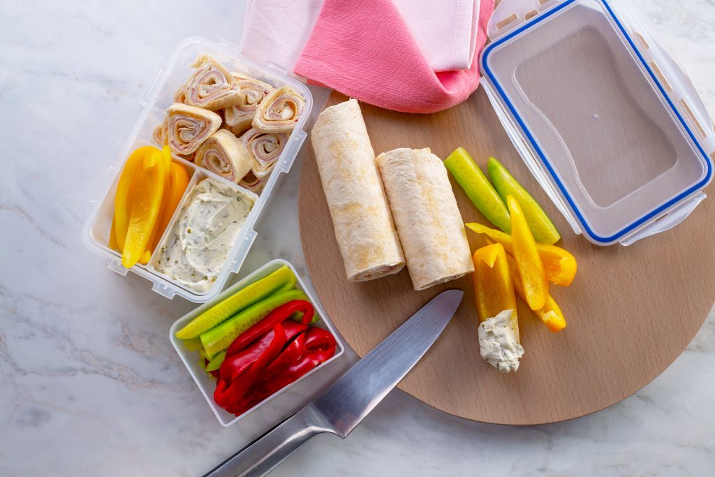 Wrapa posmaruj serkiem Philadelphia. Połóż na niego szynkę i ser żółty. Zawiń ciasno w rulon i pokrój na kawałki mniej więcej 2 centymetrowej grubości. Podawaj z warzywami i dipem.