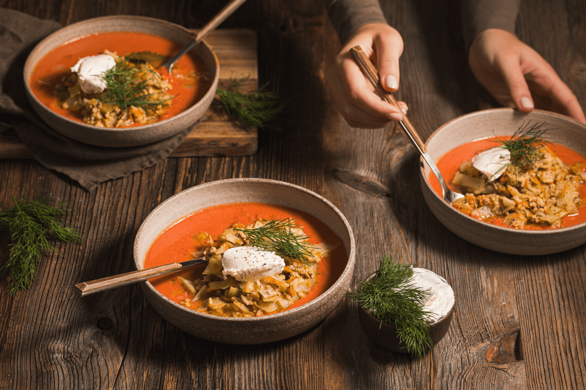 1. Do każdej miski wlej porcję gorącego kremu pomidorowego.
